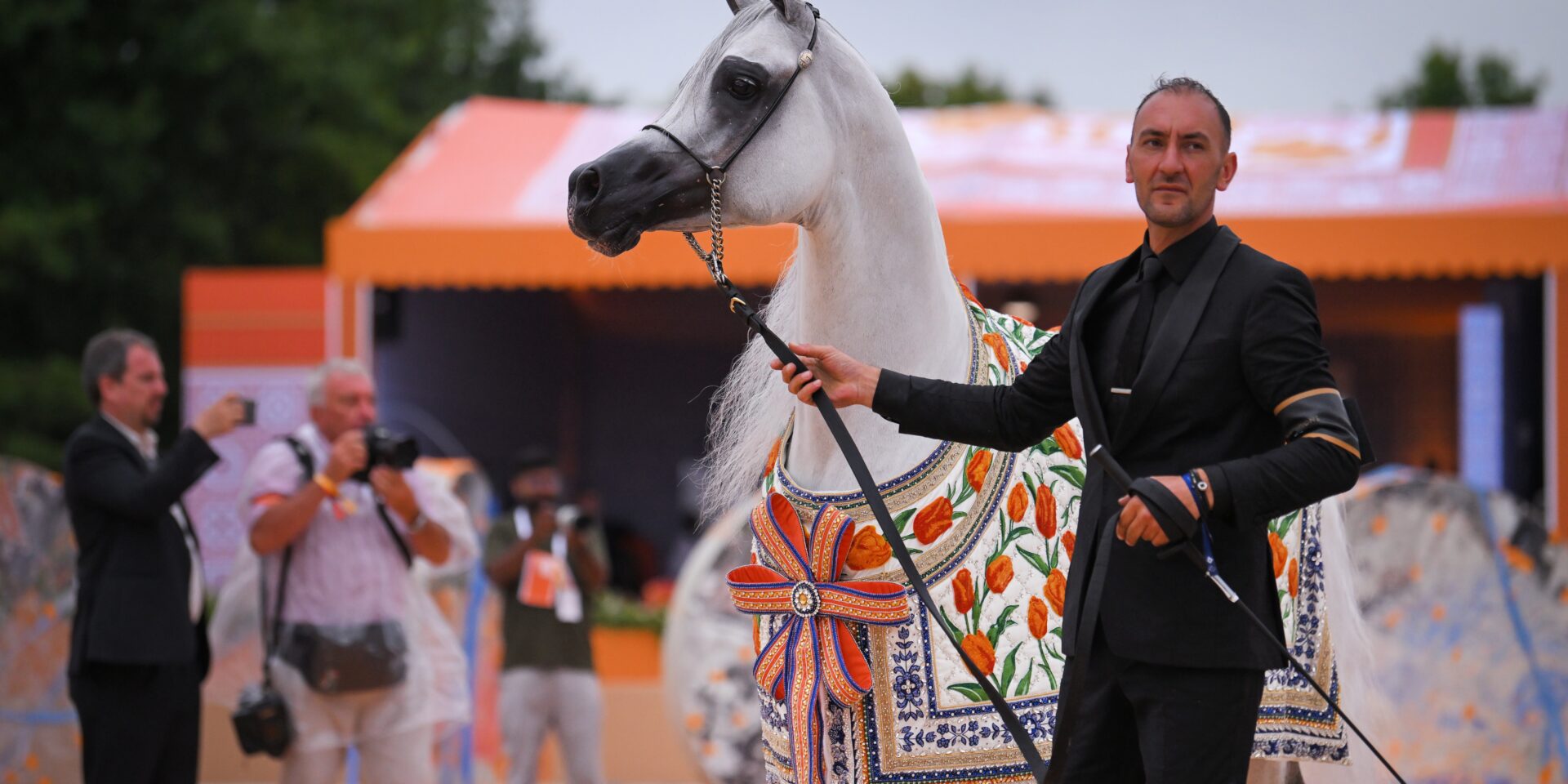 The Senior Mare and Senior Stallion awards for the Valkenswaard stage were adorned with intricate crystal and sequin embroidery of tulips and traditional floral motifs in a palette of orange and blue, celebrating the beauty of the Netherlands and the excellence of the Arabian horse.